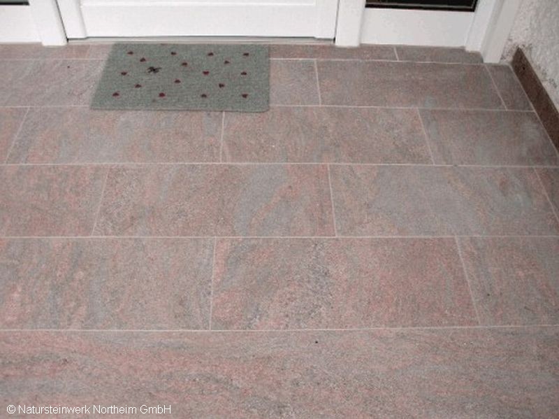 Bodenbelag Fliesen 61 x 30,5 x 1 cm mit Multicolor Rot geflammt, versetzt verlegt. Geflammte Ausführung für Trittsicherheit.