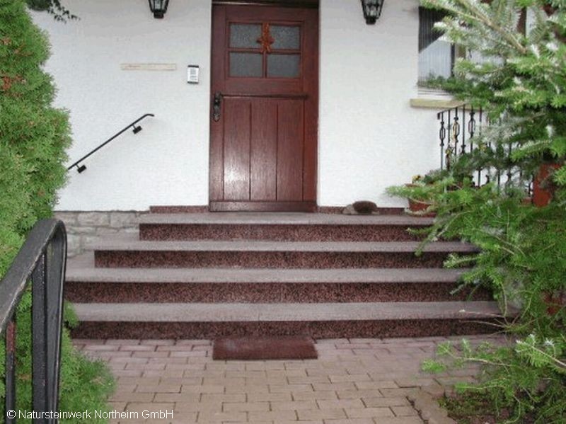 Podestplatte, Tritt- und Setzstufen und Sockel aus Balmoral Rosso geflammt/poliert.